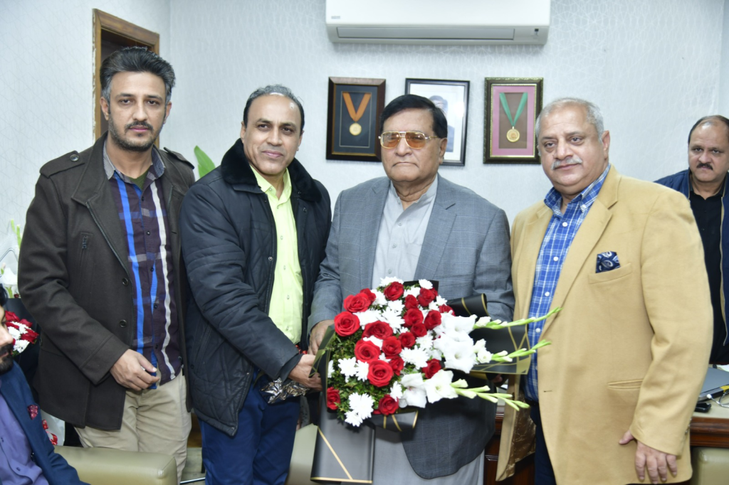 CEO Country News Media Group, Sardar Hameed and President PFUJ Afzal Butt offering flower bouquet to noted businessman Zafar Bakhtawari to congratulate him on performing Umrah