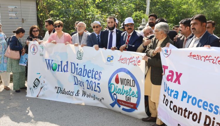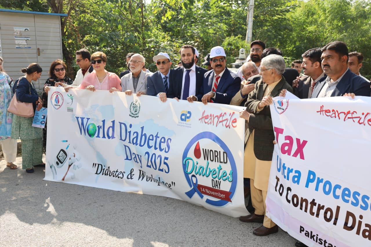 Islamabad: On World Diabetes Day, PANAH and its coalition partners organizes health mela at National Press Club Islamabad followed by awareness walk. Federal Minister for information and broadcasting Mr. Atta Tarar was the chief guest of the occasion . Experts said that Pakistan is facing an alarming rise in diabetes cases from 6.3 million in 2011 to 33 million in 2021 with another one million people at risk as pre-diabetic. This surge has placed Pakistan at the top of the global ranking for diabetes prevalence, where one in every three adults is living with the disease. Approximately 1,100 deaths are occurring daily due to diabetes and its related complications in Pakistan. Health experts warn that without urgent and effective policy measures, the number of diabetics in Pakistan could reach to 70 million by 2050. This awareness walk was jointly organized by the Pakistan National Heart Association (PANAH), Heartfile, Pakistan Youth Change Advocates (PYCA), and the Centre for Peace and Development Initiatives (CPDI). Health experts, government officials, civil society representative, youth, media and people for all walks of life participated in walk. Health experts highlighted that unhealthy diets are among the major cause of diabetes and other NCDs. Participants were carrying placards calling on the government to adopt evidence-based public health policies such as increasing taxes on ultra-processed products (UPPs, Enacting mandatory Front-of-Pack Warning Labels (FOPWL) on UPPs, and banning partially hydrogenated oils (PHOs), a key source of trans fats in the Pakistani diet.