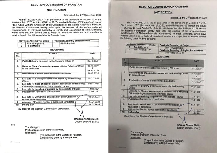 By-polls for Sindh Assembly’s PS-43 (Sanghar III) and PS-88 (Malir II) and Balochistan Assembly’s PB-20 (Pishin III) will be held on February 16, 2021, while the voters in NA-45 (Kurram I) and NA-75 (Sialkot IV) and Punjab Assembly’s PP-51 (Gujranwala I) and Khyber Pakhtunkhwa Assembly’s PK-63 (Nowshera III) will elect their representatives on February 19, 2021.