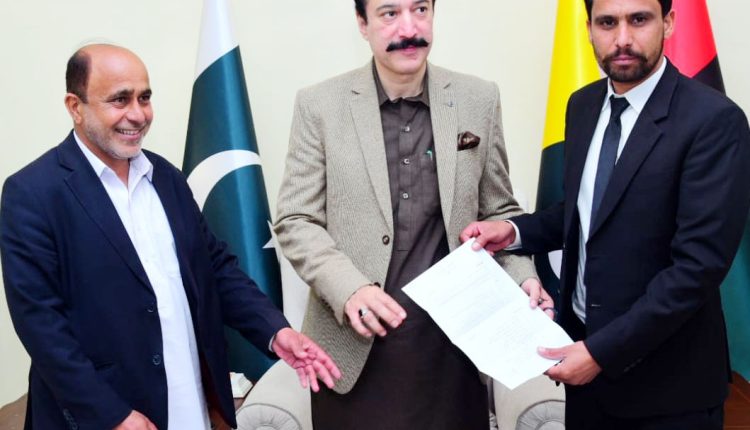Muzaffarabad: Prime Minister of Azad Jammu and Kashmir, Chaudhry Faisal Mumtaz Rathore, formally handed over the appointment notification to Awais Shaukat Advocate on his appointment as Legal Advisor to the Department of Tourism and Archaeology.