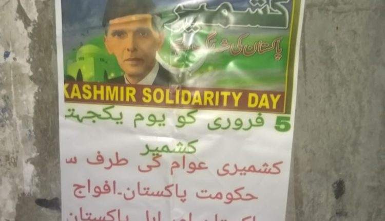 The posters read messages like “Go India go back”, “Kashmir baney ga Pakistan”, and “Kashmiris are thankful to Pakistan for observing 5th February as Kashmir Solidarity Day”.
